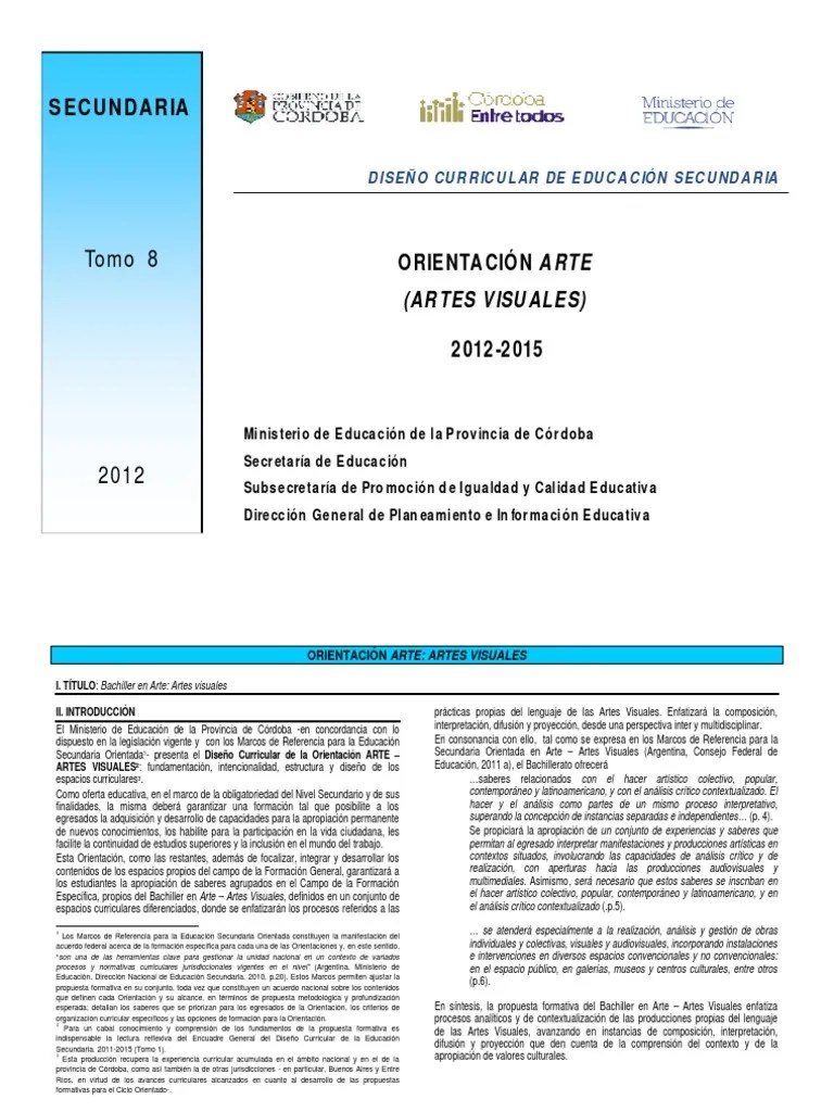Es muy interesante para conocer los nuevos formatos escolares, los nuevos conteni…. Corresponde al ámbito de las teorías del arte y de la terminología especifica. Encuadre político educativo 12 4. La educación primaria en la provincia de entre ríos 16 5. Ministerio de gobierno, justicia y educación. Diseño curricular artes visuales 4º, 5º y 6º año (es) 6º año proyecto y producción en artes visuales proyecto de producción en artes visuales se propone la intervención en un espacio público y en la ideación, desarrollo, montaje y ejecución de un proyecto propio y construido con Diseño curricular para la formación docente profesorado de artes visuales gobierno de entre ríos consejo general de educación dirección de … Enseñar y aprender en la educación primaria 7 3. Comisión de diseño curricular para la educación primaria. Debido al gran tamaño del archivo hemos tenido que dividirlo en partes, tendrán que ir pasando de una a otra y cada una tarda unos segundos en bajar.. 10.05.2018 · este material interactivo, en concordancia con los contenidos vigentes en los diseños curriculares de artes visuales, revaloriza el reconocimiento del contexto multicultural en donde se registran las producciones visuales en función de la construcción de la identidad a través del conocimiento;